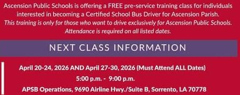 Thinking about becoming a certified school bus driver for Ascension Public Schools? Now’s your chance.