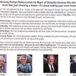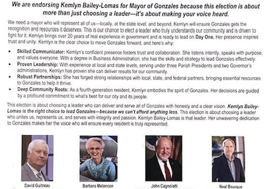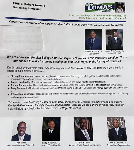 Desperate to stop Tim Riley, the black and white political establishments have landed on Kemlyn Bailey Lomas as their last best hope.  Hitting Gonzales mailboxes in recent days…