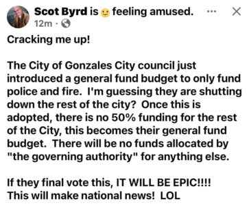 Scot Byrd, who served seven years in Mayor Barney Arceneaux’s administration, has been vocal about the current state of affairs in the City of Gonzales.  The former Chief Administrative Officer (CAO) predicted severe ramifications if the City Council has its way in the ongoing budget battle with Mayor Tim Riley.  On Friday a Special Meeting of the Council was held, called by four members (those not named Eddie Williams), for the purpose of introducing their own General Fund budget proposal, omitting every appropriation except those for police and fire department funding.