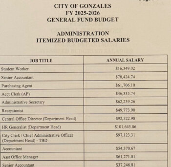 Gonzales’ City Council voted to approve an amended General Fund (Operating) Budget for the 2025-26 Fiscal Year last night, the third time being the charm after rejecting Mayor Tim Riley’s proposal on May 27 and July 14.  The amendment was sprung upon Mayor Tim Riley and at least two council members by Councilman Kirk Boudreaux, with no forewarning, and approved with support from Tyler Turner and Terri Lambert.  After seeking to table the vote, because she had not seen the amendment prior to Monday’s meeting, Cynthia Gray James joined them in approving the amended budget in a 4-1 vote.