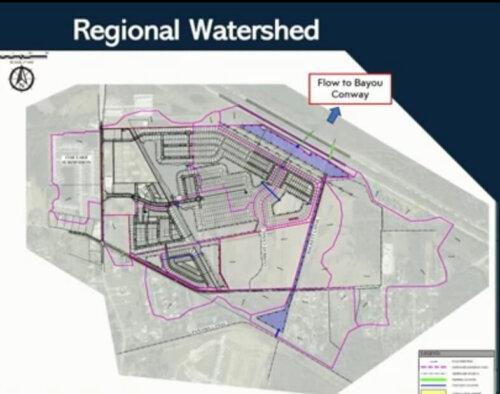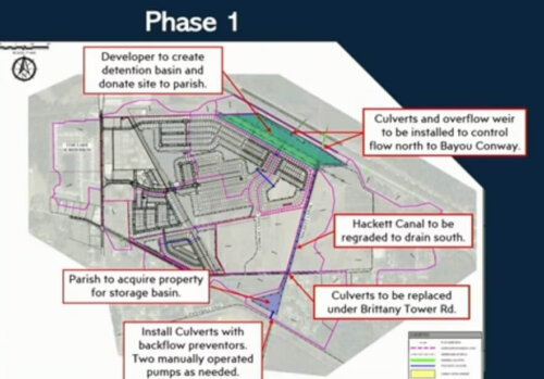 The plan, presented by Quality Engineer’s Murphy, will ultimately result in a pump station serving the “regional watershed’ totaling 726 acres, 310 acres of which houses Conway Subdivision (42.7%). Conway is donating 31 acres as part of its $3 million investment (a million in cold hard cash to defray the cost of a parish-owned and operated pump station (see Phase 2 image above).