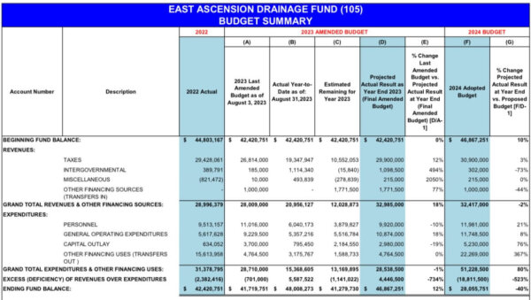 Approximately 18% of that total (in the neighborhood of $5.5 million) will emanate from inside Gonzales’ city limits.  Much of EA Drainage’s $47,867,251 fund balance is earmarked for major capital improvement projects in the pipeline for decades.