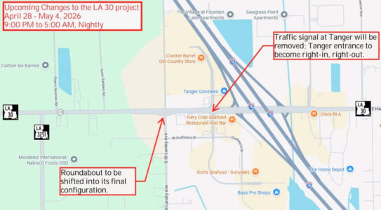 Starting Tuesday night, April 28, DOTD will implement a new traffic pattern on LA 30 between I-10 and LA 3251 as construction on the new roundabouts moves into its next phase.