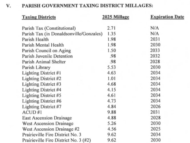 Included in Tuesday’s Parish Council Finance Committee meeting packet is the 2025 Millage Review. The report lists each individual Ad Valorem assessments levied by Ascension Parish Government.