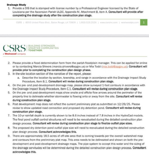 “Consultant will provide after completing the drainage study after the construction plan stage” and similar responses to Engineering Review comments is implied admission that no study has been performed.